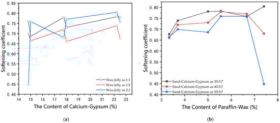 The influence curve of the content of paraffin wax and the percentage of auxiliary cementing agent on the softening coefficient of the material. (a) The influence curve of the percentage of calcium carbonate and gypsum on the softening coefficient. (b) The influence curve of the content of paraffin wax on the softening coefficient.