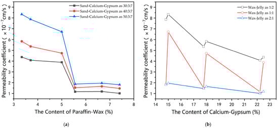 The influence curve of the content of paraffin and the percentage of calcium carbonate–gypsum on the permeability coefficient of the material. (a) The influence curve of the content of paraffin on the permeability coefficient. (b) The influence curve of the percentage of calcium carbonate–gypsum on the permeability coefficient.