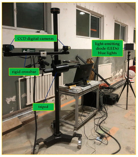 The visual monitoring system mentioned earlier for the dynamic development of the water filling channel in this experiment was the DIC digital speckle monitoring system, which is composed of two CCD digital cameras for image acquisition, with a camera resolution of 3000 × 4096 pixels, equipped with wide-angle lens, and installed on a rigid crossbar with a spacing of 1.04 m. The crossbar was fixed on a tripod, and the stereo-vision system was located approximately 2.3 m in front of the monitoring observation wall. Two sets of blue light-emitting diodes (LEDs) were positioned on the left and right fronts of the viewing wall to illuminate the monitoring surface, as shown in Figure 9.