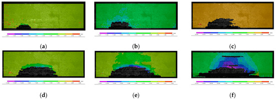 The displacement cloud diagram of the overlying rock strata of the coal seam during the advancement of the working face. (a) Advancing distance of the working face was 500 mm, directly breaking the roof for the first time. (b) Advancing distance of working face was 800 mm, and the main roof is broken for the first time. (c) Advancing distance of the working face was 1100 mm. (d) Advancing distance of the working face was 1400 mm. (e) Advancing distance of the working face was 1700 mm. (f) Advancing distance of the working face was 2000 mm.