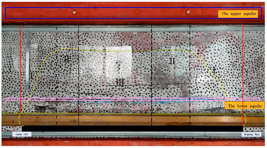- This type of similar material was successfully applied in the fluid–solid coupling model testing of the coal seam excavation face in the Majiliang Coal Mine, Datong City, China; the material guarantee was provided for the successful results of the experiment. In this fluid–solid interaction similar model test, it was found that, under the condition of double water-filled aquifers in the overlying strata of the goaf, the evolution law of the overlying strata water channel in the goaf is phased, especially after the goaf is closed, when the upper aquifer is not in the range of the water-conducting fissure zone in the closure stage of the mined-out area. However, when the distance is very close, the existence of the water-conducting fissure zone has a considerable influence on the continuous stable movement of the overlying rock, and the water-filled channels formed by the fluid–solid interaction can be divided into three symmetrical regions: Ⅰ. the development area of terraced vertical fissures on the side of coal pillar; Ⅱ. the zone of delamination fracture development; and Ⅲ. a large overhanging tension vertical fracture development area.