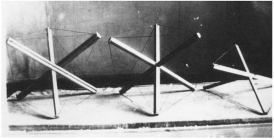 Karl Ioganson’s tensegrity prototypes showing the first example of a Simplex (figure on the left-hand side) in 1921. Reprinted with permission from Refs. [2,3].