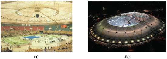(a) Geiger’s 1988 Olympic Arena in Seoul (photo from [33]). (b) Opening of completed La Plata Stadium [34] (image from https://commons.wikimedia.org/wiki/File:Estadio_Único_Ciudad_de_La_Plata.jpg, (accessed on 15 September 2022)). (c) Georgia Dome in Atlanta (from https://www.birdair.com/birdair-portfolio/georgia-dome/, (accessed on 15 September 2022)). (d) World Cycling Center dome [35] (Image courtesy of André Oribasi).