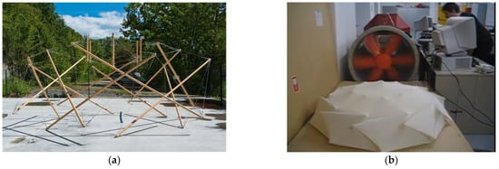 (a) Prototype for a tensegrity roof structure made of cables and bars [39]. (b) Wind turbine test on a smaller prototype made of textile membranes and bars [40]. (Images courtesy of Diana Peña).