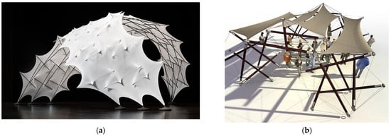 - Peña, D.M.; Llorens, I.; Sastre, R.; Crespo, D.; Martínez, J. Application of Tensegrity to Tensile-Textile Constructions—Formfinding and Structural Analysis. J. Int. Assoc. Shell Spat. Struct. 2011, 2011, 67–81. Available online: http://hdl.handle.net/2117/19912 (accessed on 23 July 2022).