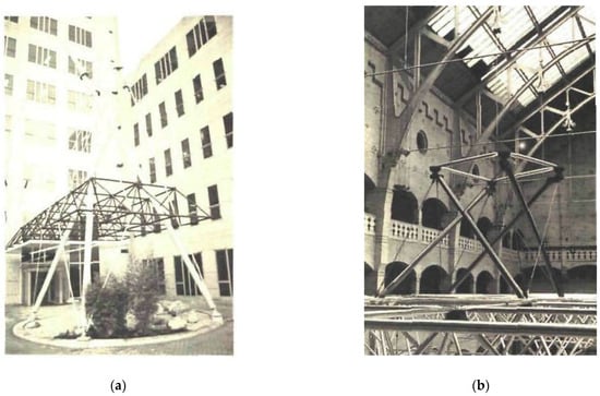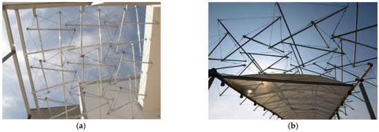 Probably, these DLTGs are the most promising tensegrity configurations for architectural roofing. These are composed of tensegrity units that form double-layer cable nets held apart by a set of disconnected rigid members. DLTGs were used again by Liapi et al. [46] to build different types of roofs. The first example (Figure 10a) shows a patio roof for a bank annex in Greece, composed of 4T-Prisms (2007) and the second one (Figure 10b) shows an Information Pavilion for “Patras Cultural Capital of Europe” in Greece, made also by the juxtaposition of 4T-Prism or Simplex (2006).