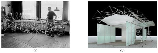 At the same time that Fuller designed the Aspension dome, Kenneth Snelson tried to reflect the floating compression concept on a roof. He included it in his first patent by using the x-shaped units [23]. However, it was not until some years later that he accomplished his idea of building the first tensegrity grid by juxtaposing several simple modules (Figure 9a). René Motro and Ariel Hanaor continued this idea related to double layer tensegrity grids (DLTGs) [14,44]. When generating a single or double curvature from them, it is possible to generate a dome-like structure. This was partially achieved by Katherine Liapi [45]. They designed a “semi-open exhibition space” submitted as an entry to the international architectural competition “Ephemeral Structure for the City of Athens” (Figure 9b). The structure is a vaulted dome composed of interconnected detachable and deployable four square-based tensegrity units.