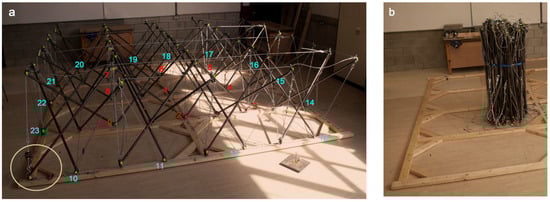 Some other prototypes of tensile tensegrity structures were proposed by Gupta et al. [41], a knit tensegrity shell composed by an elastic membrane and bamboo struts to make canopies appropriate to the warm, humid climate of Singapore (Figure 7a). Another example of canopies made with bamboo and tensile membranes is the one by Mortera Aguilar [42], although in this case it was composed by the juxtaposition of expanded cuboctahedrons (Figure 7b).