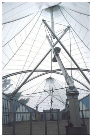 The Aspension Dome was used as an inspiration for the Olympic Fencing and Gymnastic Arena in Seoul (Republic of Korea) (Figure 4a). This stadium’s roof was built by David Geiger in 1988. The radial cables connecting the inner and the outer ring in Fuller’s design formed triangles, whereas in Geiger’s design, these belong to vertical planes passing through the central symmetry axis of the whole structure.