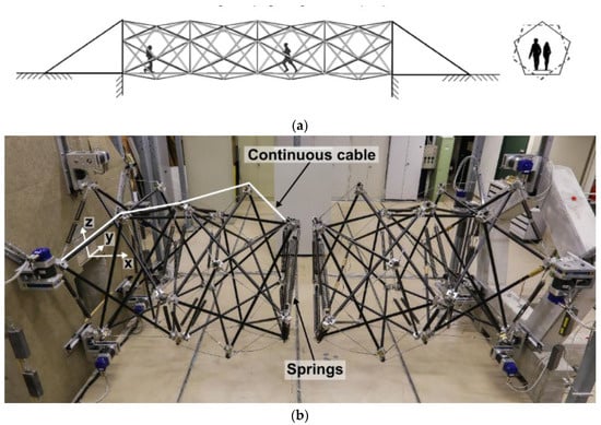 Some other prototypes for tensegrity-based footbridges have also been fabricated. One example is the pedestrian bridge designed by Rhode-Barbarigos et al. [52] (Figure 14a), composed of four identical tensegrity modules of 5 m in length, adapting a previous design by Motro et al. [53]. They developed the original concept through a parametric design study of three potential module configurations.