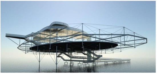 One so-called tensegrity platform is the Blur Building [58]. This tensegrity-inspired building was constructed for the Swiss Expo 2002 in Yverdon-les-Bainst, Switzerland (Figure 16). As the architects describe it, this piece was meant to mimic the atmosphere. It is built from a system of horizontal frame, vertical struts and diagonal cables that cantilever out over the lake from piles in the water. Only the vertical struts are not connected to the main frame, so the principle of tensegrity is not fully achieved.