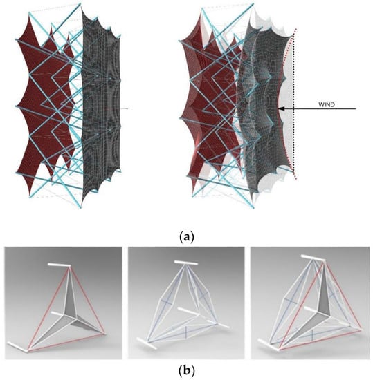 Some studies on tensegrity building facades have been conducted during the last years. The first to mention is the work by Kabošová et al. [60]. In this paper, they aimed to obtain wind-adaptive skins for buildings; with this purpose in mind, they built a DLTG in which some of the tensile elements were replaced by fabrics (Figure 18a). The shape of the structure changes due to the wind pressure, to which the structure responds passively.