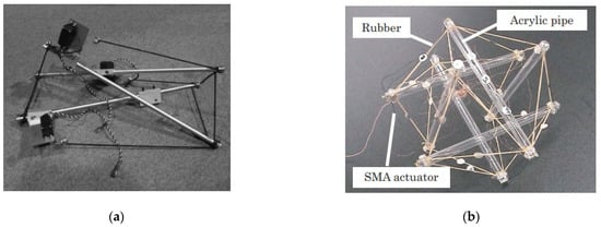 - Koizumi, Y.; Mizuho, S.; Hirai, S. Rolling Tensegrity Driven by Pneumatic Soft Actuators. In Proceedings of the 2012 IEEE International Conference on Robotics and Automation, Saint Paul, MN, USA, 14–18 May 2012. [Google Scholar] [CrossRef]