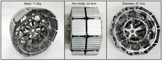 - Crowther, G.; Apostolopoulos, D.; Heys, S. Tensegrital wheel for enhanced planetary surface mobility: Part 1—Design and evolution. J. Terramech. 2022, 100, 11–24. [Google Scholar] [CrossRef]