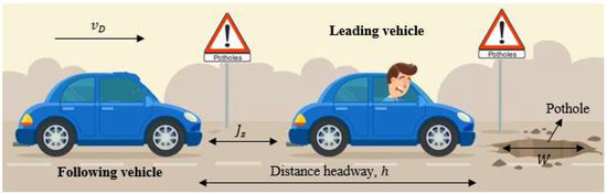 The impact of potholes on the traffic flow primarily depends on the distance headway. For a large distance headway, the distance between vehicles is large so drivers have more time to react to road surface irregularities. Thus, they can maneuver around potholes. Conversely, if the distance headway is small, the impact of these irregularities is more significant as drivers have less time to react. Thus, (4) can be rewritten as