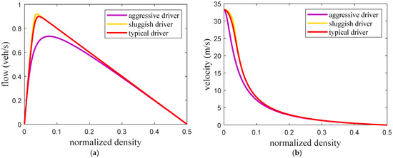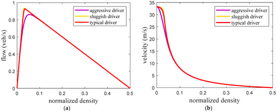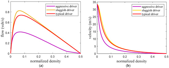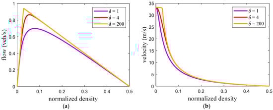 It is important to select realistic model parameters. Therefore, the parameters considered are the same as in [41]. For the proposed model, s means indicating an aggressive driver, s means indicating a sluggish driver, and s means indicating a typical driver [1]. The distance headway is m [11], the safe distance headway is m [42], and the time headway for both models is s [43]. The value of ranges between and and is typically [15], hence the ID model is evaluated for and . The maximum normalized density is .