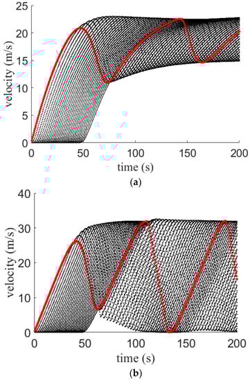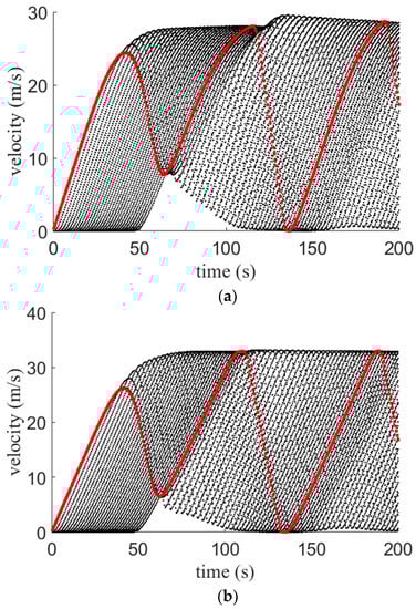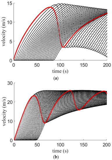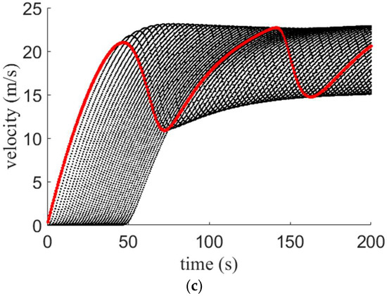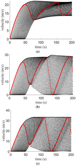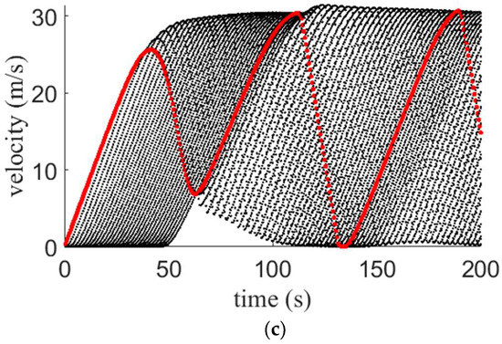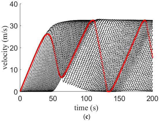 Figure 6 presents the velocity evolution over time for the ID model on a km circular road. The red line gives the velocity of the first vehicle and the black lines correspond to the velocity of the following vehicles. With , the variations are small and decrease over time. The velocity is between and m/s at s as shown in Figure 6a. With and , the variations in velocity are larger and increase over time as shown in Figure 6b,c. With , the velocity is between and m/s at s, and with it is between and m/s at s. Thus, an increase in results in an increase in the variations in velocity.