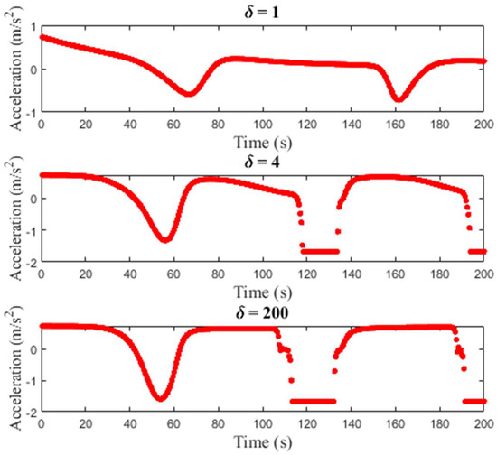 Figure 10 presents the acceleration over time of a single vehicle for the ID model on a km circular road. For all values of , the acceleration is initially m/s2 and then varies over time. With , the acceleration is m/s2 at s and m/s2 at s. At s, it decreases to m/s2 and then increases to m/s2 at s. With , the acceleration is m/s2 at s and then varies between and m/s2. With , the acceleration is similar as it is m/s2 at s and then varies between and m/s2. Figure 10 indicates that larger variations in acceleration occur with a larger .