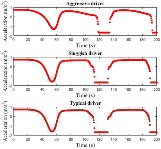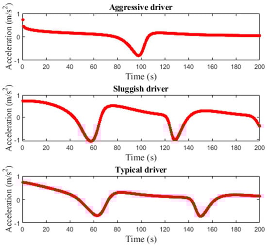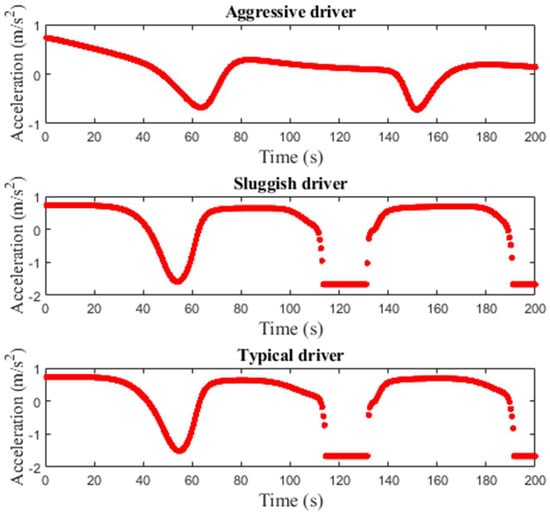 Figure 11, Figure 12 and Figure 13 present the acceleration over time of a single vehicle for the proposed model with small, medium, and large potholes, respectively. The initial acceleration is m/s2 and then varies over time. For small potholes, with an aggressive driver, the acceleration is m/s2 at s and increases to m/s2 at s. With a sluggish driver, the acceleration is m/s2 at s and then is between and m/s2. With a typical driver, the acceleration is between and m/s2 which is between that of aggressive and sluggish drivers. Figure 11 shows that for small potholes the variations in acceleration are large with a sluggish driver. For medium potholes, Figure 12 shows that with an aggressive driver, the acceleration decreases to m/s2 at s and then increases to m/s2 at s. It is m/s2 at s and m/s2 at s. With a sluggish driver, the acceleration varies between and m/s2, and with a typical driver it varies between and m/s2. Figure 12 indicates that the variations in velocity are greater with sluggish and typical drivers. Figure 13 shows that for large potholes, with an aggressive driver, the acceleration decreases to m/s2 at s and increases to m/s2 at s. It is approximately m/s2 between and s. It is m/s2 at s and m/s2 at s. With a sluggish driver, the acceleration decreases to m/s2 at s and then increases to approximately m/s2 between s and s. It is m/s2 between and s and m/s2 between and s. The velocity then decreases to m/s2 at s. The acceleration with a typical driver is similar to that with a sluggish driver.