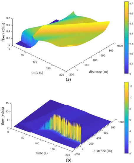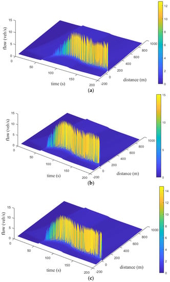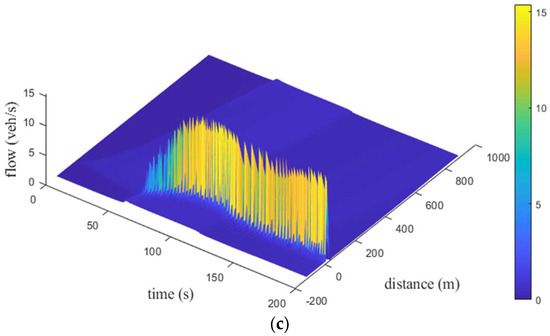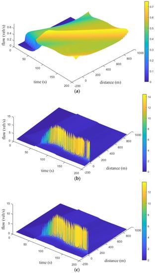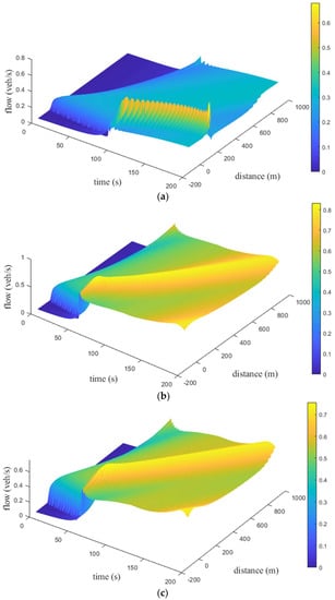 The time and space traffic flow behavior for the ID model on a km circular road is presented in Figure 14. For , at s the flow is zero and gradually increases to approximately veh/s between and s. It is veh/s at s and m, as shown in Figure 14a. At m, the flow is veh/s at s. Between and m, it is approximately veh/s and then increases to veh/s at m. For , Figure 14b shows that the flow is at s, increases to veh/s at s, and then varies between and veh/s from to s. For , the flow is at s and increases to veh/s at s. It varies between and veh/s from s to s, as shown in Figure 14c. With and , at s the flow over space initially increases to a maximum and then drops to veh/s. Figure 14 shows that with the ID model the variations in flow increase as increases.