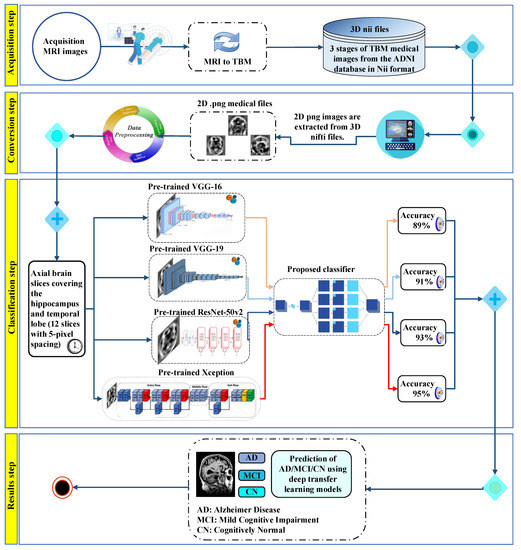 - Mehmood, A.; Yang, S.; Feng, Z.; Wang, M.; Ahmad, A.S.; Khan, R.; Maqsood, M.; Yaqub, M. A Transfer Learning Approach for Early Diagnosis of Alzheimer’s Disease on MRI Images. Neuroscience 2021, 460, 43–52. [Google Scholar] [CrossRef]