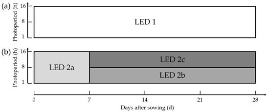 Lettuce plants were isolated from external light sources. The only light source was a PHYTOFY® RL tunable LED panel (OSRAM GmbH, Munich, Germany), designed for indoor horticulture applications. The pots were placed under the LED module at a constant distance of 55 cm and were switched places every 3 days to compensate for possible inhomogeneous distribution of light intensity by the LED module. Some lighting conditions were common to all the growth tests. A constant photoperiod equal to a 16 h day−1 was applied, with light supplied continuously from 00.00 to 16.00 without interruptions. The Photosynthetic Photon Flux Density (PPFD) was equal to 150 μmol m−2 s−1, while the daily light integral (DLI) was equal to 8.64 μmol m−2 d−1. Two different light recipes were tested for the growth of lettuce, named LED-1 and LED-2. Their spectral composition, expressed as PPFD for the different wavelengths, is shown in Table 2, and is similar to the information given in previous work [41]. Figure 1 and Figure 2 give a graphic representation of the light recipes, obtained from the data of the software supplied by the producer with the LED panel. Figure 1 shows the timespans of different spectra used in LED-1 and LED-2. Figure 2 instead shows the different spectra. LED-1 is made only of one spectrum with blue and hyper-red in a 50/50 ratio (Table 3, Figure 2a). This light recipe was chosen because it is more conventional and is more able to guarantee the stable growth of lettuce plants. In fact, the two hyper-red and blue wavelengths are often used for the indoor growth of plants [20,21,22,23]. The LED-2 recipe was designed with a triple aim, namely to promote the growth of lettuce through the alternation of hyper-red and blue, but also with the aim of trying the effect of other wavelengths, and finally to promote the germination of lettuce seeds using only hyper-red and far-red wavelengths. LED-2 is made up of three different spectra (Figure 2b–d). Spectrum LED-2a (Figure 2b) was used during the first 7 days of the growth test to promote lettuce germination (Figure 1b). Hyper-red and far-red wavelengths promote germination of other lettuce cultivars [42,43] and in LED-2a the hyper-red/far-red ratio was equal to 2 to avoid negative responses by seeds, such as stem elongation or leaf hyponasty, which are typical of the shade avoidance syndrome (SAS) [44]. In the last 21 days, the photoperiod was divided into two parts (Figure 1b). LED-2b spectrum (Figure 2c) was used during the first 8 h of the photoperiod, and spectrum LED-2c (Figure 2d) for the following 8 h. LED-2b and LED-2c spectra differ only in terms of the alternance of blue and hyper red wavelengths (Table 3). This alternance was set to promote the vegetative growth of lettuce plants after the germination phase, as suggested by [22,23]. The choice of using far-red and green in the LED-2 recipe was determined by their additional effect, which is considered positive for the growth of lettuce when these wavelengths are added in limited percentages to blue and red wavelengths.