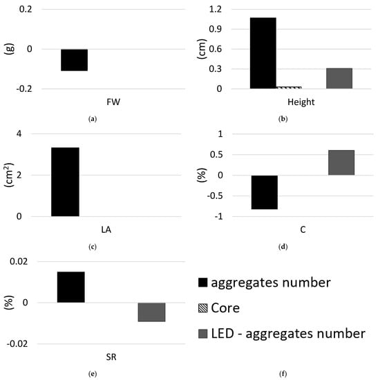 Taking into account the coefficients in Table 9, the input variable that has the most diffuse effect is the Aggregates Number alone or in combination with LED. The values of these coefficients are graphically reported in Figure 3 for a better understanding. The Aggregates Number, taken alone, is also the only variable with negative values, in particular for the response variable and C (Figure 3d), meaning that increasing the number of aggregates in general could not be a viable way to promote lettuce growth, as too many nutrients could have a toxic effect on this cultivation. On the other hand, the number of aggregates positively influence the Height (Figure 3b), LA (Figure 3c), and SR (Figure 3b). According to Figure 3a,c, FW and LA are influenced only by the number of aggregates. This variable also has a positive effect when in combination with LED, indicating that the appropriate conditions of artificial light can promote a beneficial effect of the core-shell aggregate on plant growth. The synergic effect of LED and Aggregates Number is positive for Height (Figure 3b) and C (Figure 3d) and is negative for the SR (Figure 3e). Finally, it appears that the number of aggregates generally has a greater effect than that given by the LED-aggregates number. To summarize, the number of aggregates itself promotes higher plants with larger leaves and fresh weight, but also with a lower carbon content, suggesting that the higher amount of nutrients is not totally favorable to the development of new organic matter, even if it promotes other morphologic characteristics. The synergy of the number of aggregates with LED promotes higher plants with a greater content of carbon, indicating that the appropriate combination of nutrient amount and light condition can influence both the morphology and nutraceutical characteristics of plants. This combination is also useful for tailoring the characteristics of plants at the moment of harvest, depending on the grower’s needs.