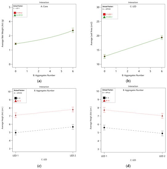 Figure 4 and Figure 5 show the graphical expression of the mathematical models calculated for each of the five significant responses as indicated in Table 9. Figure 6 shows qualitatively the morphology of plants grown with a different number of aggregates. The model for FW (Figure 4a) suggests a non-linear increase of that property when the number of aggregates increases. More precisely, the average fresh weight of lettuce is equal to 1.79 g when zero aggregates are used and is equal to 2.96 g when six aggregates are used, with an increase of FW equal to 65%. This indicates a general positive correlation between the amount of fertilizer added and the FW developed by the plants, promoting the hypothesis that both fertilizers have a good action on the growth of lettuce. This is a positive effect, since lettuce plants with higher fresh mass means a higher yield. In this case, the type of fertilizer does not have an effect on the accumulation of a fresh mass of lettuce. This means that the presence of the fertilizer glass does not affect the yield of lettuce, so the use of the fertilizer glass is not strictly recommended for the increase of fresh lettuce mass. According to Figure 4a, the best quantity of fertilizer for lettuce is the maximum considered in this study, namely six aggregates. The model suggests that the use of greater quantities of fertilizer could further increase FW without problems, since no signs of phytotoxicity were detected on the plants. Also, the use of greater quantities of fertilizer could lead to an increase of lettuce yield without any complication, since the slow release should avoid the excessive release of nutrients into the growth substrate. The other two responses related to morphologic properties show a linear behavior. In fact, LA (Figure 4b) shows a stable linear increase with a higher number of aggregates, which is again the only factor that is statistically reliable for this response. In this case, the average leaf area of the lettuce is equal to 13.00 cm2 when no aggregates are used and is equal to 19.00 cm2 when six aggregates are used, with a percentage increase of LA equal to 46%. This result highlights again the positive effect of both fertilizers on the growth of lettuce, since lettuce plants with broader leaves are an indicator of greater development. The increase of both LA and FW is an indicator of the health of the lettuce, since the plants obtained using six aggregates (Figure 6c,d) show a higher yield and development compared to plants obtained using no aggregates (Figure 4a,b). A different behavior is shown by Height that is highly dependent on the type of aggregates (in single) and on the type of light recipe (in interaction). The Height increases linearly with the number of aggregates, and this happens for both APV50 (Figure 4c) and APnut (Figure 4d), as the height of plants with six aggregates (red dashed lines) is always higher than the height obtained using no aggregates (black dashed lines). In particular, when APV50 fertilizer is coupled with the LED-2 recipe (Figure 4c), the use of zero aggregates corresponds to a height of 6.00 cm, while the use of six aggregates leads to a height of 8.00 cm, with a percentage increase equal to 33%. The same numbers are obtained using APNUT fertilizer (Figure 4d) but, in this case, the maximum height is reached when the LED-1 light recipe is used. In fact, the comparison in Figure 4c,d shows that the two combinations, LED-2/APV50 and LED-1/APNUT, of the light recipes and fertilizer type, each with six aggregates, allow lettuce to reach its maximum height, equal to 8.00 cm. On the contrary, the model suggests that the two combinations, LED-1/APV50 and LED-2/APnut, when applied with six aggregates result in a lower height of plants, equal in both cases to 7.00 cm. These findings may indicate that the two fertilizers have a different release pattern of nutrients, in particular for nitrogen and phosphorus, as previously highlighted in [39]. Each of the two fertilizers combines better with one of the two light recipes, suggesting that each recipe promotes the exploitation of different nutrients, as also suggested by other authors [51,52].