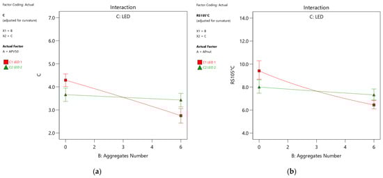The response variable C represents the content of organic carbon of plants, which is also an indicator of the content of soluble sugar in the plants. As shown in Figure 5a, C is mainly influenced by two factors according to Table 8, namely the Aggregates Number and the light recipe. However, it is worth noting that the LED-2 recipe guarantees a stable content of C near 3.7%, independently from the number of aggregates, while the LED-1 recipe tends to lower C with the increase of aggregate amounts. The maximum value of C is 4.5% with no aggregates, while the minimum value is 2.8% with six aggregates. The type of aggregate seems not to influence the response variable C, consistent with Table 8. The different behavior of C in LED-1 and LED-2 could be explained by considering the positive synergy among the Aggregates Number and the LED variables, which act differently according to the light recipe used. In fact, it seems that this synergy is greater for LED-2 than for LED-1. The response variable SR (Figure 5b) shows a behavior similar to that of C, since its value remains almost constant at near 7.9% with the LED-2 light recipe but decreases in a non-linear way with LED-1, from 9.5% to 6.8%. This behavior could be explained by the use of green and far-red wavelengths in the LED-2 light recipe. Green light penetrates the deeper strata of the plant canopy and allows the whole structure of the plant to perform the photosynthesis, promoting the fixation of CO2 on the abaxial side of leaves better than blue and red wavelengths [29,31], while red and blue are intercepted by the adaxial side of leaves and the upper canopy, which is saturated [53]. The role of the green wavelength is also recognized in the increase of dried mass in lettuce plants, when green is coupled with other wavelengths and added in a limited amount [54]. Also, the far-red wavelength has a role in helping the development of the dry mass of plants when coupled with other wavelengths [55], even if at a low percentage [25]. This would be consistent with the relatively greater values of C and SR found in plants when LED-2 is used, and the number of aggregates is higher. Therefore, the model suggests that using the maximum amount of fertilizer, equal to six aggregates, is more beneficial with the LED-2 light recipe. This is because the use of other wavelengths like green or far-red enhances the CO2 uptake and biomass development in lettuce when the plants grow in a substrate enriched with nutrients. These nutrients promote the morphologic properties of the lettuce (Figure 4 and Figure 6b,d), allowing the plants to develop a deeper canopy, which hinders the penetration of red and blue light in the lower leaves or in the leaves’ abaxial side. On the contrary, when no fertilizer is used, the morphologic development of lettuce is lower, as shown again in Figure 4 and also in Figure 6a,c, and the use of only red and blue is enough to saturate the whole canopy of lettuce plants, since there is no deeper strata. A possible way to enhance the action of green and far-red light could be to add far-red at the end of the 16 h photoperiod, as suggested in [55], to avoid the reduction of the leaves’ absorbance of the green spectrum. However, C and SR have higher values when the Aggregates Number is lower and the LED-1 light recipe is used (Figure 5a,b), suggesting that lettuce plants may develop better with only blue and red wavelengths when less nutrients are available. A possible explanation for this phenomenon is that, when plants show lower FW and LA, the canopy is less developed and deep, and the role of green and far-red wavelengths is less important.