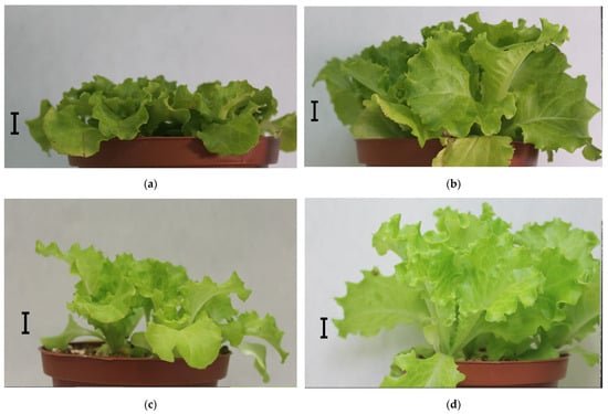 Examples of plant morphology occurring with (a) 0 aggregates LED-1, (b) 6 aggregates LED-1, (c) 0 aggregates LED-2, and (d) 6 aggregates LED-2. The black reference bar corresponds to 10 mm.