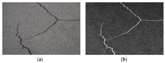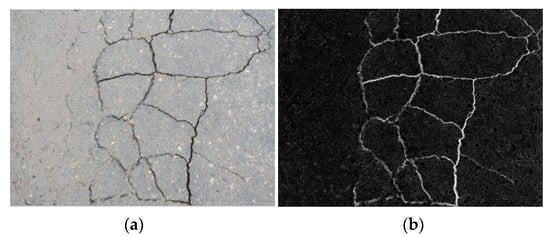 Figure 3. Test results of image feature enhancement for asphalt concrete pavement cracks: (a) original image; and (b) enhanced image.