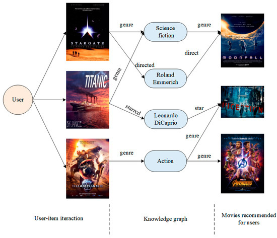 However, MKR still confronts three challenging problems. The first problem is that when modeling users and items, the potential features of users and items are excavated by only using the multilayer perceptron (MLP) in the RS module. This approach fails to capture crucial user–item interaction features and obtain users’ behavioral preferences, which reduces recommendation accuracy. The second problem is missing data in the cross-compression unit, leading to the loss of original semantic information during the compression process. Consequently, the deep semantic information of the original data is not adequately captured. The third problem involves the insufficient acquisition of potential multi-relation neighborhood feature information in the KGE module. MKR solely relies on the MLP in KG to capture entity features, thereby failing to obtain the complex and significant multi-relation features in the surrounding neighborhood of a given entity, which leads to the knowledge graph completion problem. As shown in Figure 1, “Stargate” was viewed by the user, which is a science fiction movie directed by Roland Emmerich. By using knowledge connections in KGs, the system suggests “Moonfall” to the user. However, it is unclear whether the recommendation is based on genre or on the director. The importance of each relationship to the user is not clearly defined. Therefore, it is crucial to model the relationships in KGs.