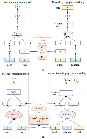 In this section, compared to the base model MKR, as shown in Figure 2a, we introduce MDAR in detail, which is a multi-task learning method for DeepAFM and RMGAT enhanced recommendation, as shown in Figure 2b. MDAR comprises three main components: the DeepAFM recommendation module, the RMGAT knowledge graph embedding module, and DNN cross and compress units. On the left side is our DeepAFM recommendation module, which utilizes the AFM layers to extract the low-order features and the DNN layers to extract the high-order features from the interactions between users and items. On the right side, RMGAT is employed to aggregate the neighborhood information of items, enabling a comprehensive representation of their characteristics for better recommendations. The middle part of the system consists of DNN cross and compress units, which connect the DeepAFM and RMGAT modules. The units capture higher-order interaction features between items in the RS and entities in the KGE. By enhancing the utilization of the data through the overall learning of the three components, we significantly improve the performance of recommendation systems.