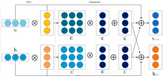 where , and indicate the number of hidden layers and d denotes the dimension of the hidden layers. This process is called a cross-operation because the interaction feature matrix displays and models each feature interaction between the item and its corresponding entity. The item feature vector of and the entity feature vector of in the next layer are obtained from the feature matrix by compressing it, as shown in Equations (19) and (20):