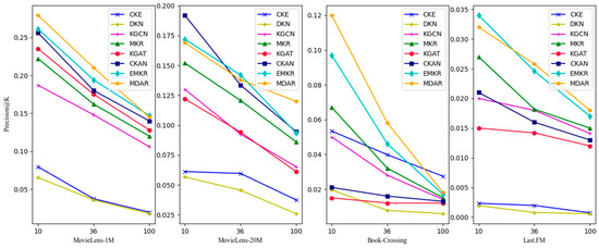 The precision rate is used to indicate how many of the items that the model predicts users may be interested in are items that the user will actually be interested in when the users have not interacted with items. The formula of precision is as follows in Equation (25).