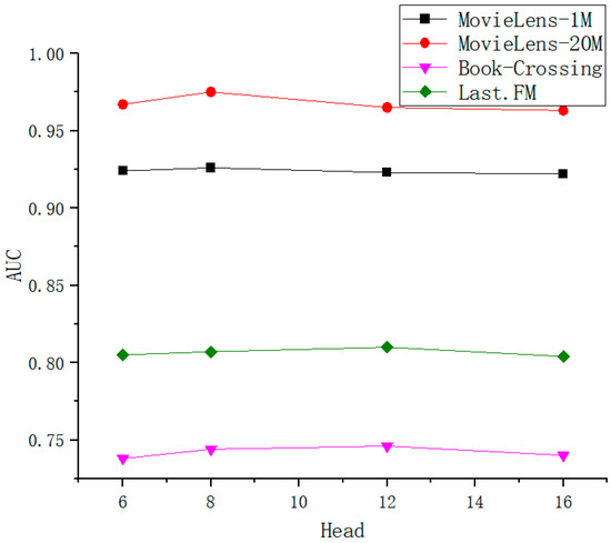 To assess how the number of attention heads affects the performance of the model, we conducted experiments on four different datasets. As shown in Figure 10, on the movie datasets, the AUC peaks when the number of attention heads is 8, while on the book and music datasets, the AUC peaks at 12 attention heads. The number of attention heads is different for different datasets, but there is an improvement in performance for all of them. This is because multiple attention heads can focus on the importance of different features, which not only stabilizes the learning process but also prevents overfitting. When the number of attention heads is 8 or 12, the experimental results are optimal. However, as the number of attention heads increases, redundant information is introduced, which degrades the performance of the model.