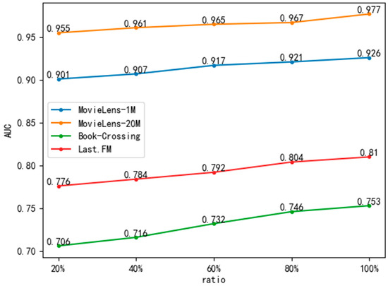 As Table 10 and Figure 11 show, we conducted experiments on sparsity to evaluate the performance of our model. The results indicate that there is a consistent increase in the AUC as the ratio increases, with the highest value achieved at a ratio of 1. Specifically, when the ratio is increased from 0.2 to 1.0, our model shows an average improvement in the AUC of 2.5%, 2.2%, 4.7%, and 3.40%, surpassing the baseline MKR. These findings demonstrate that the MDAR model performs well even in situations with limited user–item interactions.