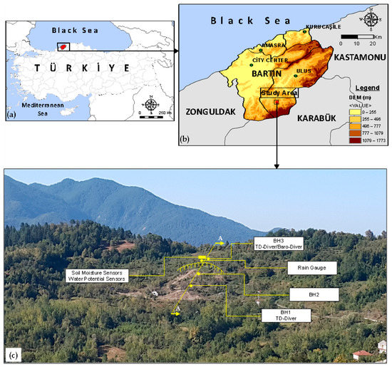 Bartin is located in the Western Black Sea Region of Türkiye (Figure 1). Rainfall-induced landslides are quite frequently observed in the city. Topography, climate and ground profile provides a suitable environment for rainfall-induced landslides. In the studies conducted in the past, it has been reported that sudden and multiple landslides occurred in the city, especially after the rainfall events in 1985, 1998 and 2016. The landslides in 1985 occurred in April as a result of snowfall in the winter season and the subsequent rains. The landslides in 1998 developed as a result of continuous rain on 20–21 May. The reason for the landslides which occurred in 2016 was heavy rain on 12–13 August. Some singular landslide cases were also observed at various times in other years. According to GIS-based studies carried out for Bartin by the Türkiye Disaster Affairs General Directorate, landslides that occurred in the city were concentrated in the Cretaceous flysch deposits, which are defined as the Ulus formation. According to Reference [44], the Ulus district of Bartin, which gave its name to the Ulus formation, is the district where the most landslide cases occur in Türkiye. As a result of landslides in the past, significant damage to the infrastructure and superstructure occurred, and many agricultural and forest areas became unusable.