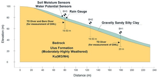 Subsurface ground investigation was performed by boreholes drilled to a depth of 20 m at the foot (BH1), 19.50 m in the main body (BH2) and 19.50 m in the crown (BH3) (Figure 1 and Figure 2). Disturbed (D) and undisturbed (UD) soil samples and rock core samples were obtained for laboratory tests. Two piezometers were installed in the boreholes of BH1 and BH3 to examine groundwater level variations. UD soil samples were taken in accordance with ASTM D1587 [45] with Shelby tubes at sufficient numbers and depths to define the soil profile. The wireline drilling method using a double tube core barrel was used in rock formations.