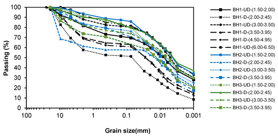 When the grain size distributions are examined in Figure 3, it can be observed that they presented scattering. Grain size ranges: 2.3–34.0% for the gravel; 8.4–23.8% for sand; 20.9–38.4% for silt; and 18.4–54.7% for clay.