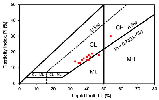 The ranges of Atterberg limits are given in Table 1. The distribution of the soils in the plasticity chart is presented in Figure 4. As shown in Table 1 and Figure 4, most soils were classified as CL and distributed close to the A line in the plasticity chart.
