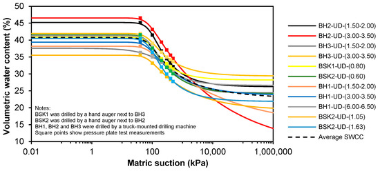 where τ is the shear strength; c′ is the effective cohesion; ø′ is the effective friction angle; is the total normal stress; is the pore air pressure; is the net normal stress; is the pore water pressure; is the matric suction; is the volumetric water content; is the residual volumetric water content; is the saturated volumetric water content. In addition to the effective shear strength parameters, SWCC, which shows the relationship between matric suction and water content, should be defined to calculate the shear strength. In this study, the average SWCC in Figure 6 was used as the soil water characteristic curve. The soil properties used in the stability analyses are summarised in Table 6.