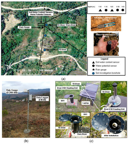 Location of boreholes and installed sensors. (a) Location map, EC-5 and MPS-6, (b) ECRN-100 rain gauge, (c) Diver sensors.