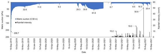 As observed in Figure 9 and Figure 10, the start of rainfall measurement on 23 February 2021 in the landslide area enabled the comparison of the volumetric water content matric suction with rainfall after this date. Between 23 February 2021 and 7 May 2021, a total of 250 mm of rain fell on the hillslope, with a daily maximum rainfall of 28 mm and an hourly maximum rainfall of 10.2 mm. In this period, volumetric water content was around 47%, and the matric suction was around 8.6 kPa. Between 7 May 2021 and 14 September 2021, a total of 463 mm of rain fell in the study area, with a daily maximum rainfall of 96.8 mm and an hourly maximum rainfall of 50.6 mm. After May 2021, heavier and less frequent rainfall was observed. Prolongation of the rainfall intervals reduced the volumetric water content by allowing the soil to dry.