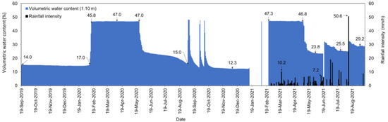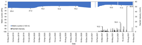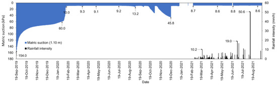 The responses of volumetric water content and the matric suction at a depth of 1.10 m are given in Figure 9 and Figure 10. Initially, the volumetric water content was 14%, and the matric suction was 154 kPa. The volumetric water content gradually increased to 17%, and the matric suction decreased to 60 kPa on 1 February 2020. The reason for the rapid decrease in matric suction equilibrium establishment of the sensors with the surrounding soil, according to the second law of thermodynamics. Between 1 February 2020 and 14 February 2020, the matric suction decreased from 60 kPa to 10 kPa, and the volumetric water content increased from 17% to 45.8%. Between 14 February 2020 and 25 May 2020, the volumetric water content was around 47%, and the matric suction was around 9 kPa. The volumetric water content decreased step by step after 25 May 2020 and reached 15% on 5 September 2020. On the other hand, there was no significant variation in the matric suctions, contrary to the expectation of an increase. A similar behavior was also observed in cases where the volumetric water content decreased step by step after 7 May 2021. This phenomenon may be due to a change in the shape of the SWCC because of crack formation in the soil. Cracks develop in soil due to drying, and this affects the mechanical and hydraulic properties of soils [54,55]. Various studies, such as References [56,57,58,59,60], have reported that the formation of cracks in clayey soils causes significant changes in the soil water characteristic curve. For an illustration, Zornberg et al. [59] observed that crack development increased the slope of the soil water characteristic curve at the transition zone. This results in higher volumetric water content changes but more limited matric suction changes beyond the air-entry value. According to Li et al. [57], the soil cracks deform during the drying and wetting stages, and the changes in crack volume and suction have a direct impact on the soil water characteristic curve of cracked soil. It is possible to explain the differences in the matric suction and volumetric water content values in Figure 9 and Figure 10 based on this information in the literature.