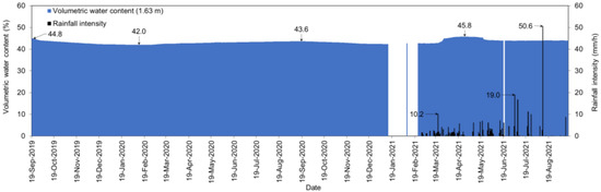 The variations in the volumetric water content and matric suction at a 1.63 m depth are presented in Figure 11 and Figure 12. It can be remarked that at this depth, the volumetric water content and the matric suction did not change remarkably and were not affected extensively by seasonal climatic conditions. During the observation period, the volumetric water content was 42–46%, and the matric suction was measured between 21.5 and 10.0 kPa, at this depth.