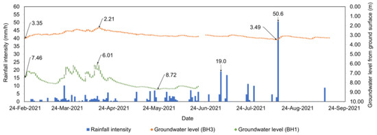 Variations in groundwater level with rainfall intensity in BH1 and BH3.