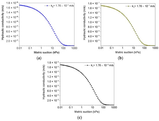 Hydraulic conductivity function used in rainfall infiltration analyses. (a) ks = 1.76 × 10−6 m/s, (b) ks = 1.76 × 10−7 m/s, (c) ks = 1.76 × 10−8 m/s.