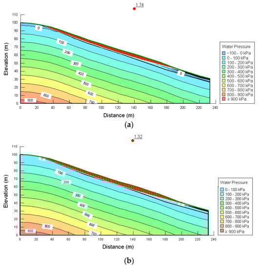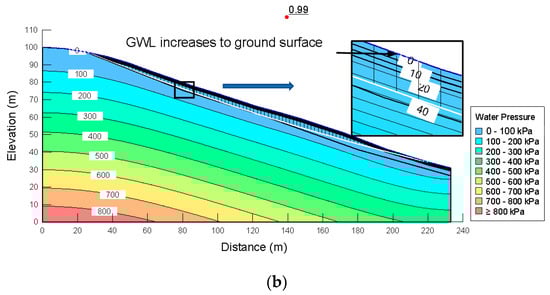 Factor of safety and pore pressure distributions. (a) Dry period, (b) Wet period.