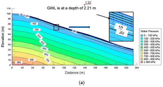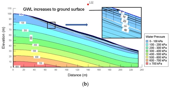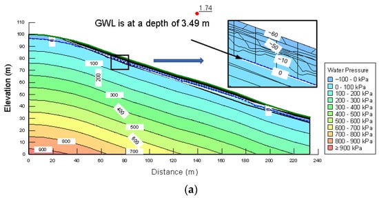 Pore-pressure distributions and critical factor of safety for stability at dry and wet periods are presented in Figure 15a,b. FoS was calculated as 1.74 for the dry period and 1.32 for the wet period. The analyses are important to reveal how stability is affected by changes in the soil matric suction profile and positive pore water pressure, depending on seasonal conditions in the landslide region.